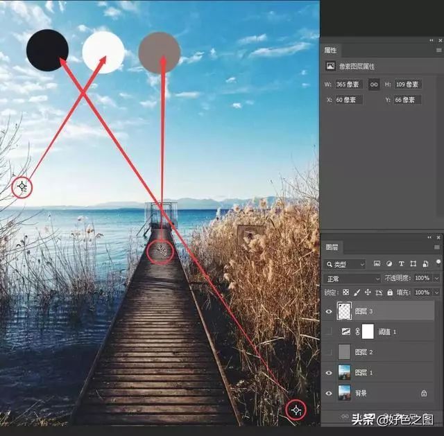 三个圆圈中,就是前面步骤中做的三个取样点,分别是阴影、高光和中间调。也就是说,这三个主色系,已经被我们确定下来了。