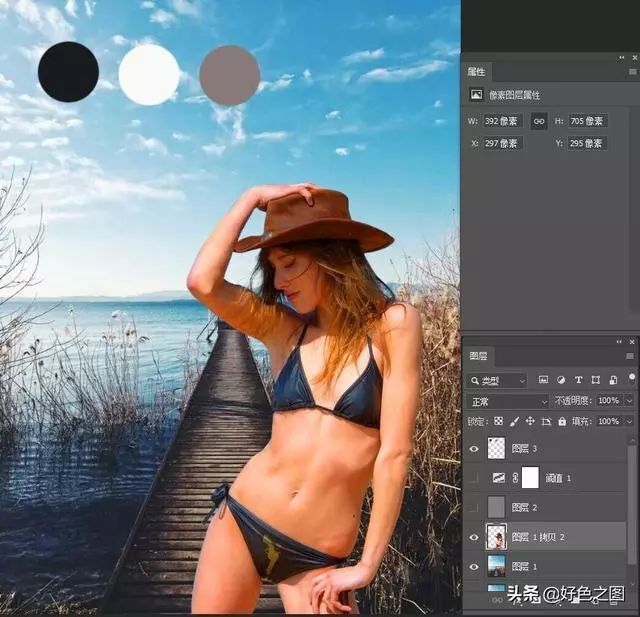到这里,包括暗部、高光、中间调三个主色系,都被我们以圆点的形式画在了照片上。接下来,鼠标点击图层1,把之前抠图好的人物素材拖入画面中:
