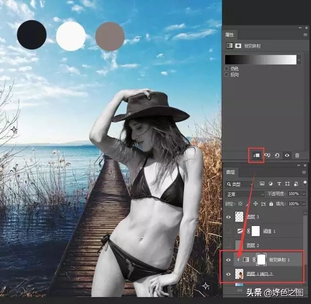 这时可以看到,除了人物颜色之外,其他画面颜色并没有受到黑白渐变的影响。而图层面板上也发生了变化,人物图层的名称上,出现一条横线,渐变映射图层前方,也出现了一个向下的箭头。这个功能的具体作用,用我自己的大白话来解释,就是只对它下方图层生效,不会影响其他图层。