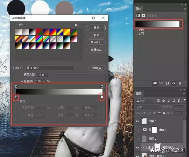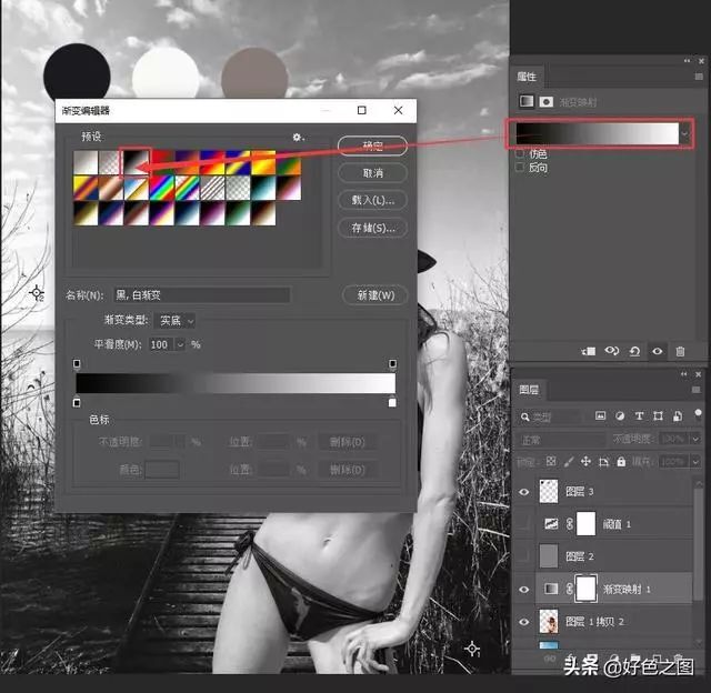 在属性面板中,点击渐变条,就会弹出"渐变编辑器"窗口,选择第三项"黑白渐变"。点击确定,完成设置。