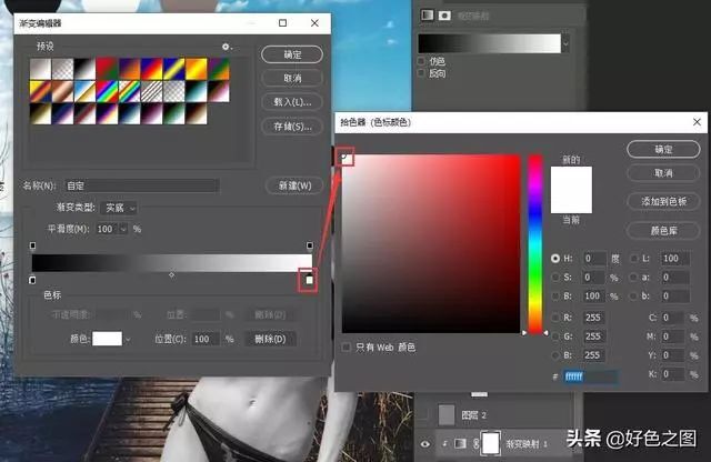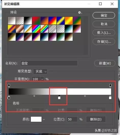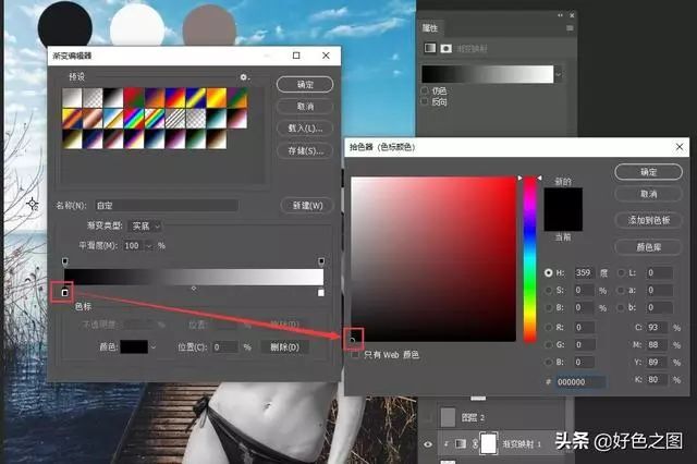首先要确定一下,渐变编辑器的黑白渐变,是不是纯黑和纯白。先用鼠标双击红框标记处的黑色滑块,就会弹出拾色器,在拾色器中,选择最黑的颜色,设置好后点击确定: