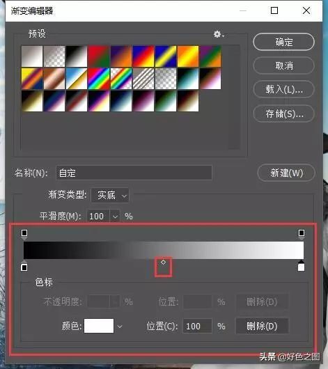 好了,继续用鼠标点击属性面板上的渐变条,弹出渐变编辑器: