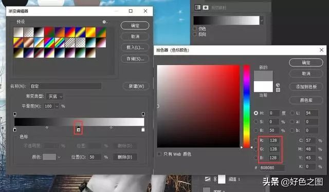 双击这个滑块,就可以弹出拾色器,进行颜色设置。黑白两种颜色都设置好了,这里就是设置中性灰了呗,在拾色器的RGB三个数值面板中,都输入128,点击确定,我们就得到了一个绝对中性灰的滑块,点击确定完成设置: