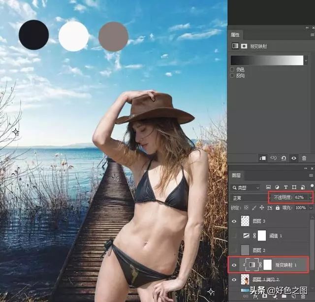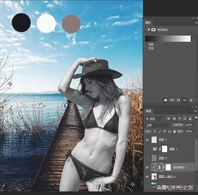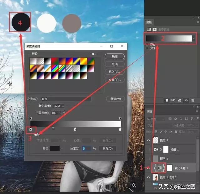完成这四个步骤,暗部颜色就定义好了,接着点击白色滑块,吸取白色圆点上的颜色。再点击中间的灰色滑块,吸取灰色圆点上的颜色。做完这些后,点击确定,渐变映射的颜色,就彻底被我们之前对黑白灰三处的取样颜色所替代了。