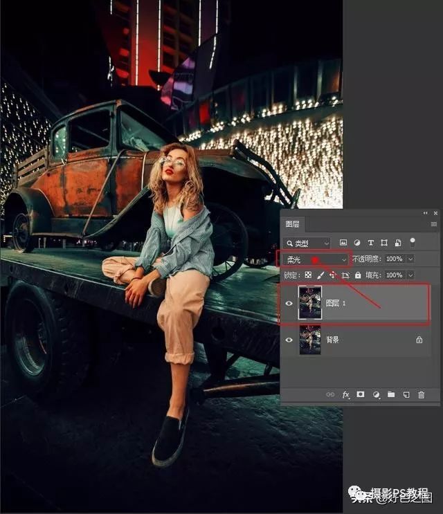 在PS中打开素材图片,第一步,复制图层(CTRL+J),将图层混合模式修改为"柔光"(这一步的作用是增大图片对比,为后面的烟雾烘托效果,如果你的照片本身对比度就比较大了,那么不修改图层混合模式也可以)。如图: