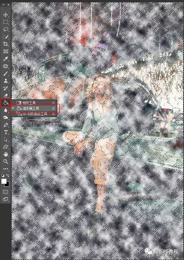 此时图层颜色也因为退出快速蒙版,而从红色恢复到灰色了。接下来,将前景色设置为白色,长按工具栏上的渐变工具,会弹出二级菜单,在菜单中选择漆桶工具,点击画面,为选区填充白色,效果如下:
