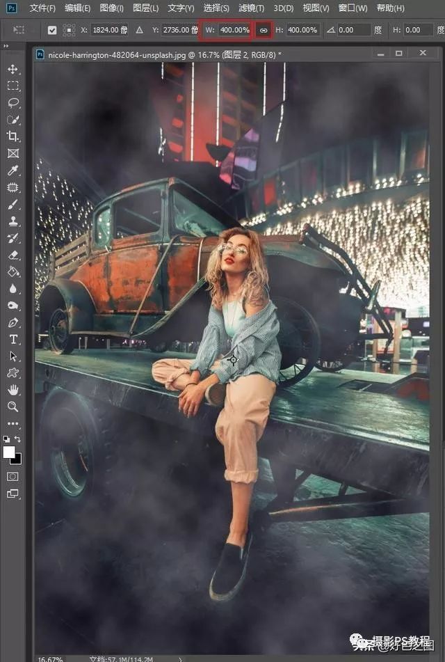 现在的烟雾看起来太密集了,所以下面使用快捷键CTRL+T进入自由变换,上方会出现自由变换参数栏(详细使用方法请看我的教程《为照片添加逼真下雪效果》,里面有详细的介绍自由变换工具用法)点击锁定长宽比按钮后,在W或H中输入400,将烟雾图层放大400%,现在看看,烟雾效果就自然多了吧: