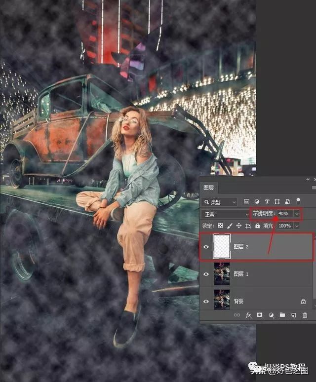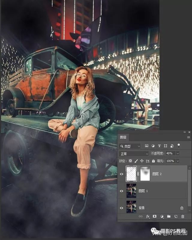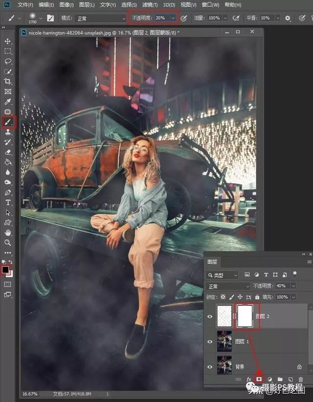 烟雾整体弥漫的太多了,我想让图片上半部分的烟雾少一些,只在下半部有就可以。那么下一步,为烟雾效果图层建立一个"图层蒙版",前景色设置为黑色,使用画笔工具(快捷键B),将不透明度设置在20%左右(不透明度越低,涂抹效果越柔和),在图片上半部的烟雾上进行涂抹,把自己认为不需要的烟雾擦掉就可以了,包括人物脸上。