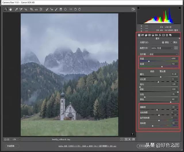 经过了HSL部分的调整,照片颜色整体已经是比较冷的色调了,但是还不够,接下来进入分离色调中,为高光区域和暗部区域定义色调: