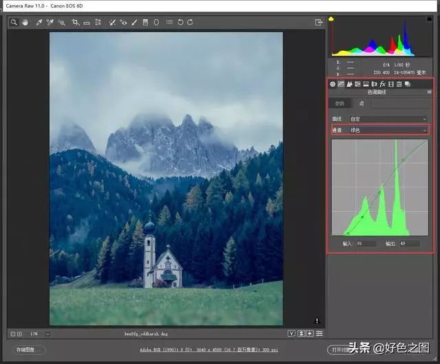 将红色通道的暗部向绿色调整,就能看到照片的暗部整体呈现出绿色。接着调整绿通道和蓝通道,调整方法都很类似: