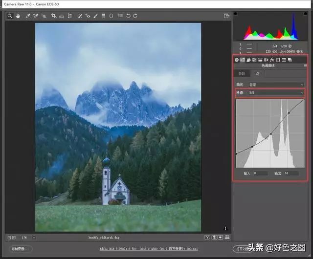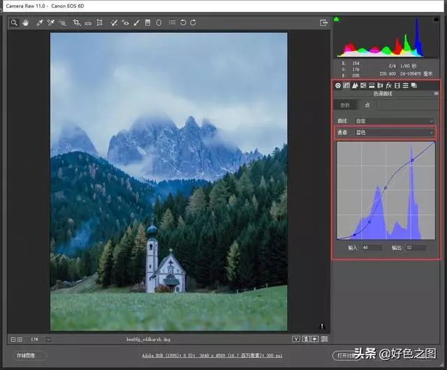 三个色彩通道调整完成,可以看出照片暗部颜色更偏向冷色调,对比度也增加了。但是我们需要灰蒙蒙的感觉,无需这么大的对比,所以现在要去RGB复合通道中,去降低暗部对比: