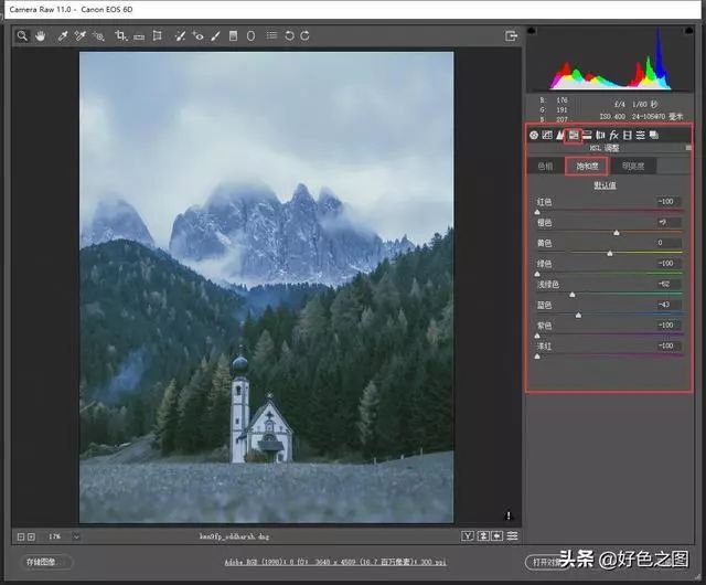 在饱和度面板中,我将红色、紫色、洋红的饱和度全部降低为0,因为整张照片中,完全无需出现上述这几种颜色,是多余的,所以,不管颜色占比有多大,不管是否明显,数值全部降低为0。降低蓝色饱和度,让天空和远处山体的蓝色不那么醒目。