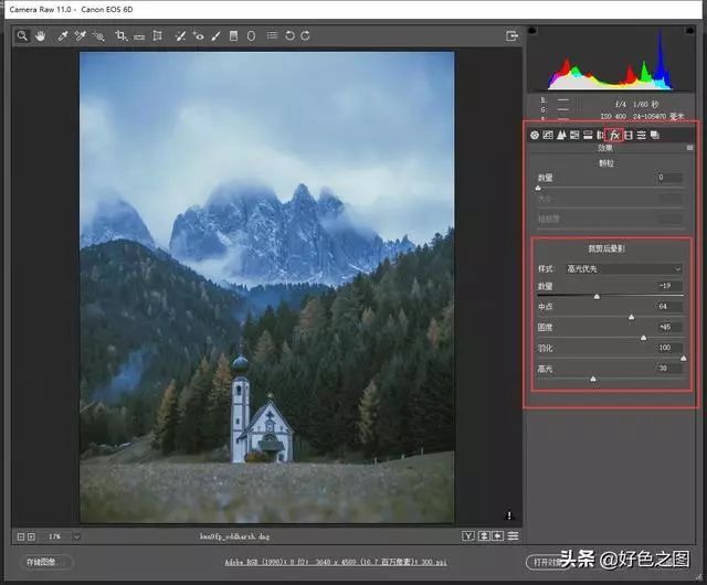 在"裁剪后晕影"中,向黑色方向调整数量滑块,是增加暗角,反之,则是增加亮角。将羽化值设置的大一些,使添加的暗角过渡更均匀。