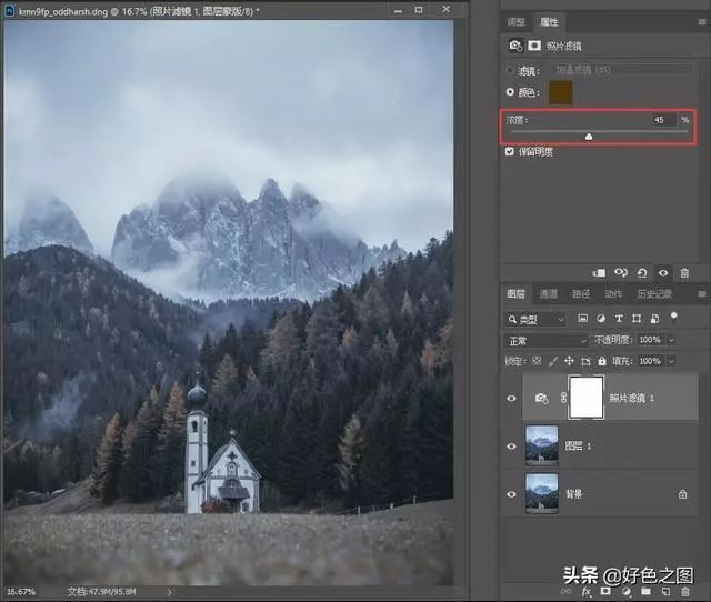 将照片滤镜的浓度增加,中和一下照片过蓝的效果,使整体感觉变得厚重些: