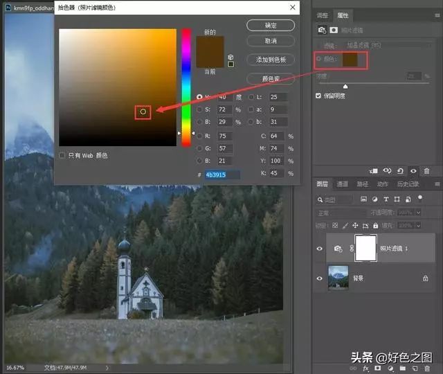 鼠标点击照片滤镜的颜色,会弹出拾色器,在拾色器中,选择深棕色,点击确定: