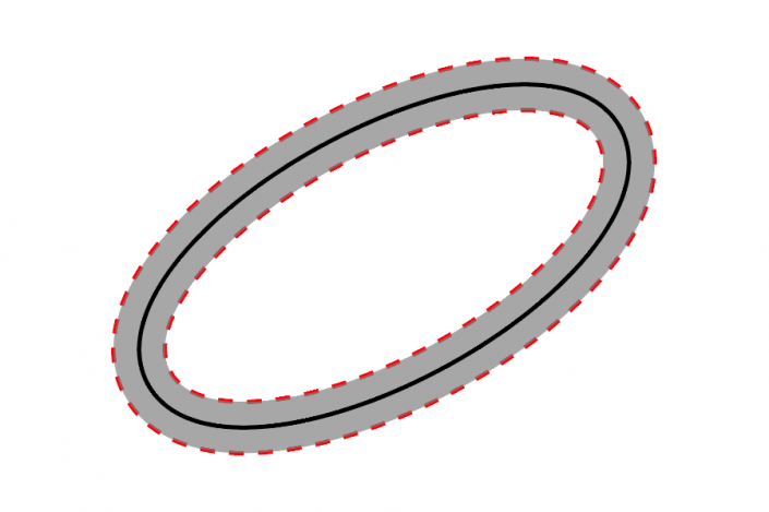 如上图所示,黑色的路径是初始的选区形状,执行“边界”命令并设置一定的数值(假设为X)后,黑色路径就会同时向内、向外扩展(X/2),从而出现了两条路径,图中红色虚线所示。