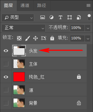 f)因为我们擦除的是“主体”图层上头发上的杂边,并不会影响“头发”图层。此时将“主体”图层与“头发”图层分成两部分的作用就凸显出来了。