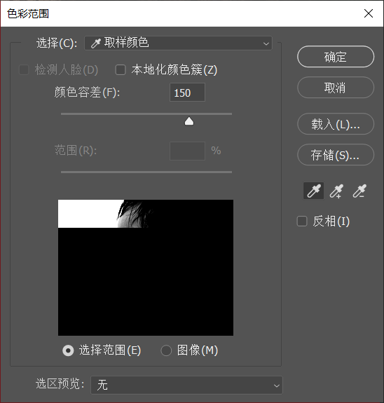 b)接着对“头发”图层执行【色彩范围】命令,吸取背景颜色(白),将容差设置为150。