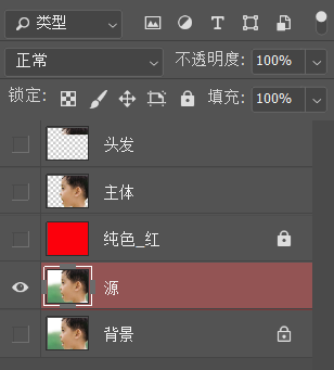a)首先使用【矩形选框工具】,从“源”图层中框选出头发,然后按Ctrl+J将其复制到新图层中,并命名为“头发”。
