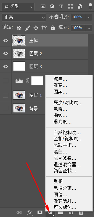 b)方式2:在图层面板中,点击“创建新的调整图层”按钮,在打开的下拉列表中选择一个调整图层。