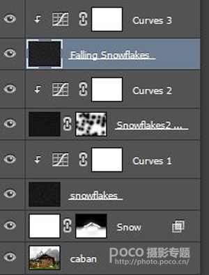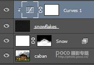但现在的雪花看起来不太好看。因此,可添加一个曲线调整层来解决这个问题。创建一个新的曲线调整图层(图层>新调整图层>曲线),并使曲线图层只对下一图层起作用(按住Alt,鼠标移到两个图层中间点击一下)。