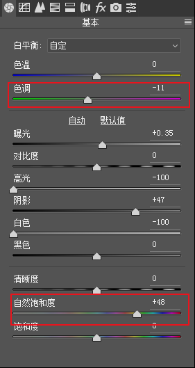 下面实现思路3:色调偏绿。我们可以将基本调整的色调往左-绿色方向调整同时可以适当提高自然饱和度,让画面色调的调整更明显。