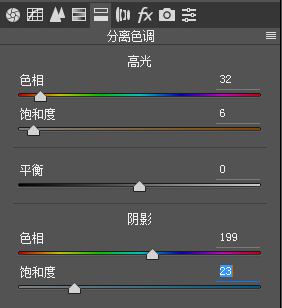 到这步,其实很多人已经很满意,但是我觉得画面的层次感不是很强,所以我又动了色调分离来实现思路4:高光偏蓝、阴影偏绿。选择分离色调工具:在高光里面加入暖色橙黄色,阴影里面加入冷色青蓝色,从而形成冷暖对比。