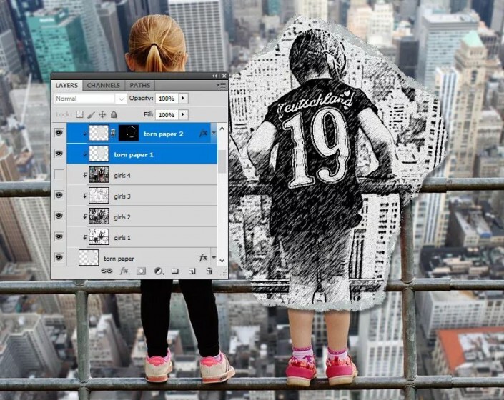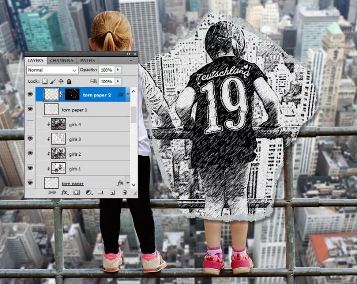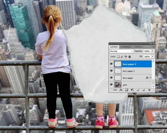 第4步按Ctrl-J 两次,以制作“ 撕纸” 层的两个副本 ,并将它们称为“ 撕纸1” 层和“撕纸2” 层。