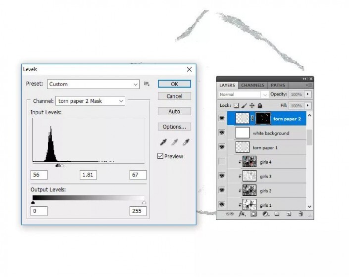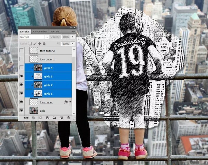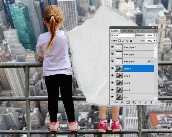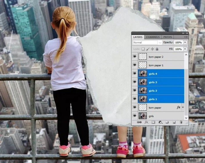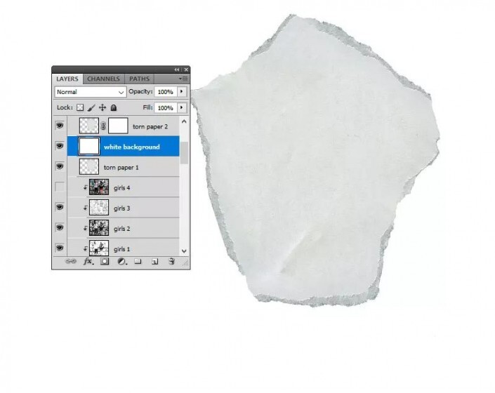 第2步按住Ctrl键并选择“ 女孩1” 层,“ 女孩2” 层,“ 女孩3” 层和“ 女孩4” 层。将它们移到“撕纸层” 上方。