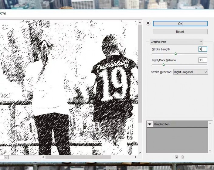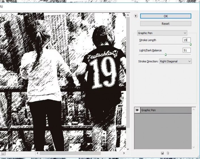 第2步转到“ 滤镜”>“素描”>“绘图笔”。对于另一张图像,您可能必须调整这些设置。
