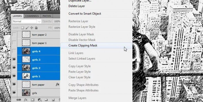 8. 用剪贴蒙版http://www.yuucn.com/tags/38847/创建素描纸按住 Ctrl 键并选择“ 女孩1” 层,“ 女孩2” 层,“ 女孩3” 层和“ 女孩4” 层。右键单击所选图层,然后选择“ 创建剪贴蒙版http://www.yuucn.com/tags/38848/”。