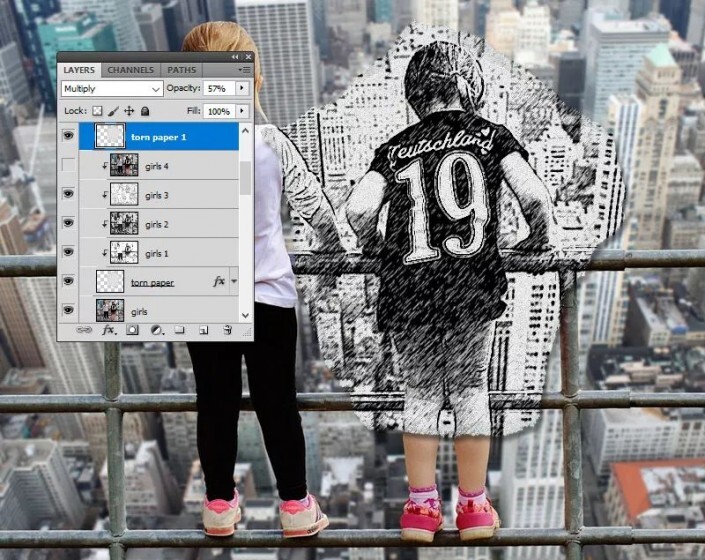 9. 创建撕纸边框第1步使“ 撕纸1” 层可见,并将混合模式设置为“ 正片叠底” ,不透明度为57%。