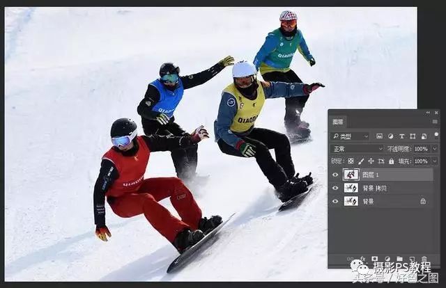 如果有擦过了的地方,可以按快捷键X,切换前景色与背景色的位置,让黑色在上,白色在下,继续用橡皮工具擦,就可以恢复图层蒙板中隐去的内容了。都擦好了,就观察一下滑雪素材的位置和大小,如果位置不满意,就按快捷键V,使用移动工具拖动图片,放到适合的位置。如果大小不满意,则使用变换工具(CTRL+T)继续缩放图片,直到自己感觉大小合适为止。都调整好了,就可以合并可见图层,并保存图片了。