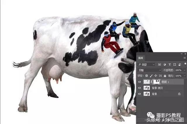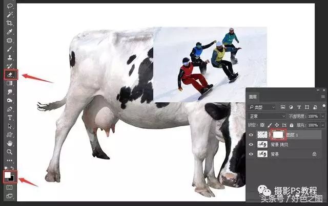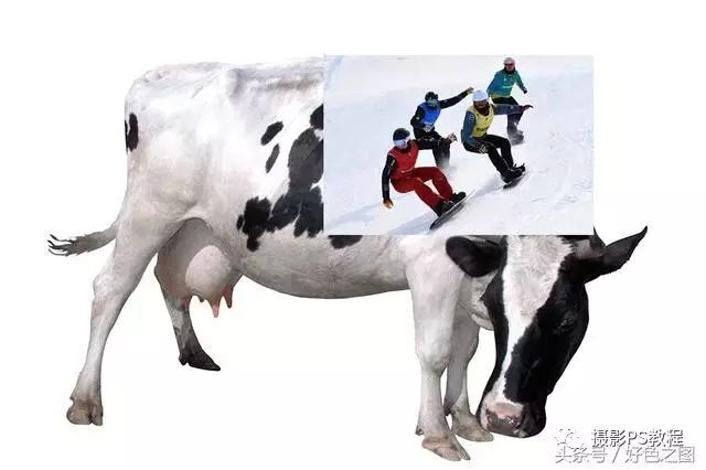 在图层蒙板中擦去滑雪素材中的雪地部分,使之与下层奶牛素材背部相融
