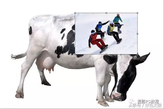 首先在PHOTOSHOP软件中打开两张图片,在滑雪人物素材图片上按快捷键http://www.yuucn.com/photoshop/jiaocheng/110097.htmlCTRL+A全选,然后CTRL+C复制选区内全部内容,回到奶牛素材图片上,CTRL+V粘贴刚才复制的内容。效果如图: