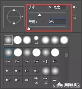 大家看红框内的两个滑块,这个我们在“快速蒙版与画笔工具”一节中介绍过,如果忘了就翻阅一下前面的教程。设置好橡皮擦大小,把硬度设置为0,这样擦出来的蒙板边缘会比较柔和。菜单栏下面一点,还有不透明度选项,设置为100%就可以,设置好了以后,就开始操作。