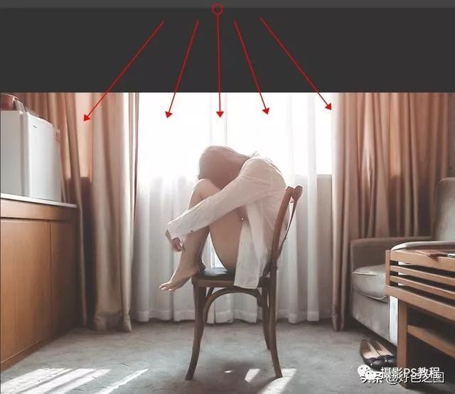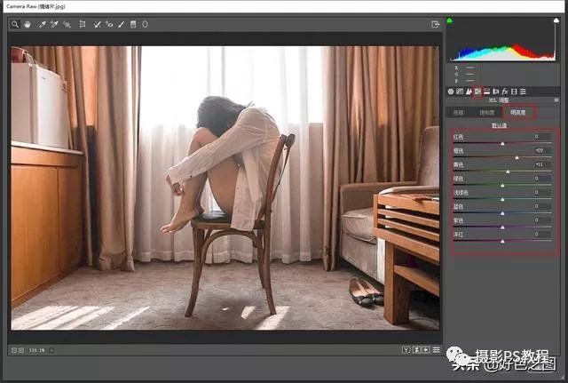 现在看一下,照片整体已经完全亮起来了。降低高光的作用是让窗户位置过曝的地方显现出层次,而增加白色的目的,是让窗口进来的光呈现漫射状。