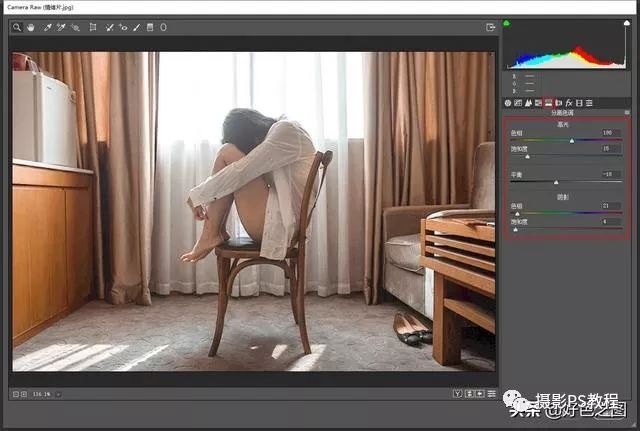 进入"分离色调"面板,针对照片的高光和暗部进行颜色调整: