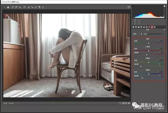 大家注意看右侧调整面板,我把浅绿色和蓝色的饱和度降到了最低,使因为图片正中的窗棂,有这两种颜色,而青绿色在这张照片中是多余的,破坏了色彩统一,所以消除它。