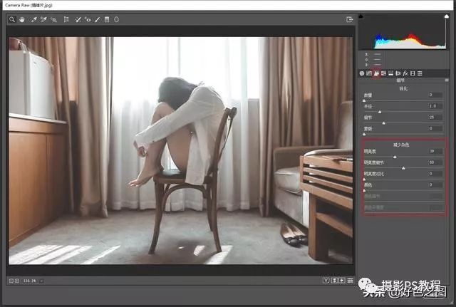 由于照片是JPG格式,原片曝光又比较暗,这样大幅度提亮,会出现很多噪点,所以我们来给照片降噪。进入"细节"面板,在"减少杂色"中,增加明亮度: