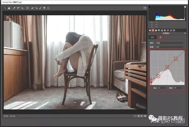 接下来我们给照片增加灰度,增强光线的漫射感,进入"曲线"面板,使用鼠标左键建立新节点,将"高光"、"中间调"、"阴影"锁定,将最左下角暗部节点向上提升: