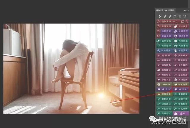 最后一个步骤,为照片添加冲光效果,顺便了解DR4.5加强版的功能,展开DR4.5面板,找到"冲光B" ,点击一下,就会生成一团光晕: