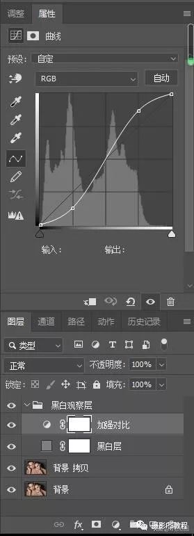 这时我们看到图层面板上,新增加了一个带有文件夹图标的图层,这就是"图层编组"。(编组的作用就是把N个图层可以放在同一个组内,方便操作和管理)。点击编组图层左侧的眼睛标志,就会看到照片变成黑白的了,而且明暗反差加大了。再点击眼睛右侧的向右箭头">",就可以展开编组,我们看到里面有两个调整图层,分别是"黑白层"和"加强对比"。黑白层就是添加了黑白调整图层。加强对比其实就是个S形曲线,这个我们之前在《浅析“曲线”工具》一节中也讲过,没看到的朋友可以点击查看。看到这两个调整图层,也就明白了为什么显示图层编组后,照片会变黑白和加大反差了。