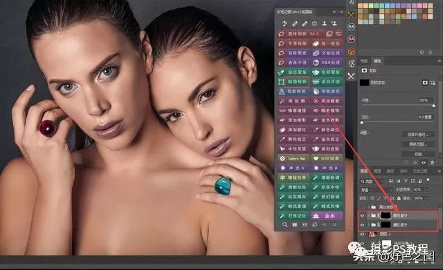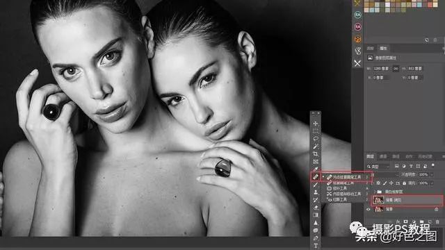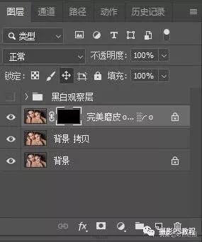 这个"黑白观察组"的作用顾名思义,就是观察用的,主要用于修饰皮肤。大家可以反复点击观察组图层前面的眼睛标志,来查看照片人物皮肤上的瑕疵,在黑白模式下,瑕疵显得更加明显了,这样也方便我们查找问题,以便修饰。