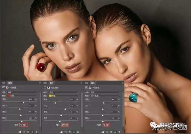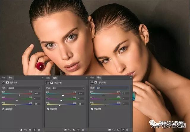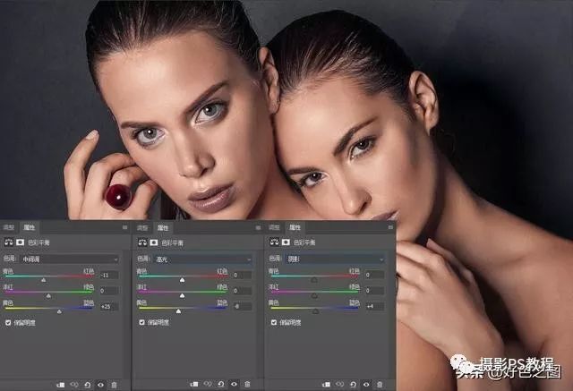 经过磨皮后,皮肤又干净了许多,接下来,在图层面板下方点击类似太极的那个图标志,新建"色彩平衡"调整图层。将"中间调"加红色、黄色,"高光"同样加红色和黄色,使人物颜色偏暖,"阴影"加青色和蓝色,使暗部颜色冷一点,与中间调和高光的暖色形成一点反差:
