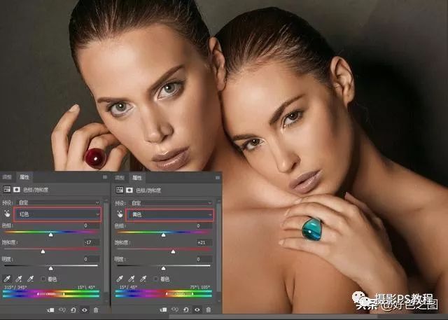 现在看一下人物的肤色,红色减弱了一些,也暗了些,红里带青,已经基本接近我们想要的效果了,别急,还要继续调整。新建"色相饱和度"调整图层,减少红色饱和度,增加黄色饱和度,让照片中的红色再少一些,黄色增加一些: