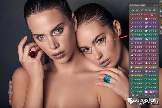 再一次盖印图层(CTRL+SHIFT+ALT+E),打开DR4.5面板,点击"眼部修饰"前面的小方框,这个小方框的功能是建立矩形选区。点击后注意看PS工具栏,也已经切换至建立矩形选区的工具了(快捷键M)