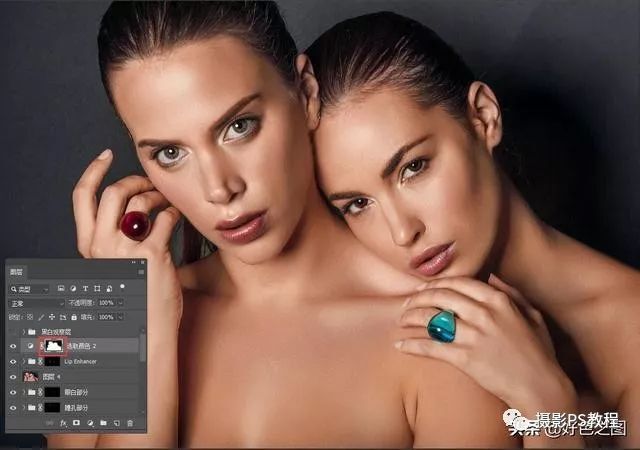 继续盖印图层(CTRL+SHIFT+ALT+E),因为我们在前面调整"色相饱和度"的时候,降低和红色饱和度,连同人物的嘴唇颜色也被降低了,现在我们把颜色调整回来。在DR4.5面板上点击"嘴唇增强",会得到一个黑色蒙版的图层组,和上一步相同,用白色画笔涂抹人物嘴唇: