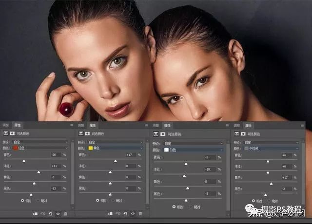 新建"可选颜色"调整图层,继续对颜色做细化调整。在红色里减青色、黑色和一点黄色,加洋红。在黄色中增加青色。在白色中减少青色、洋红和黑色。在中性色中加青色、洋红、黄色,减少一点黑色: