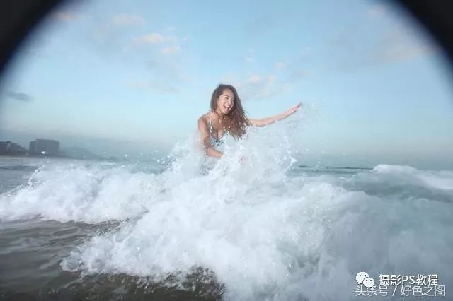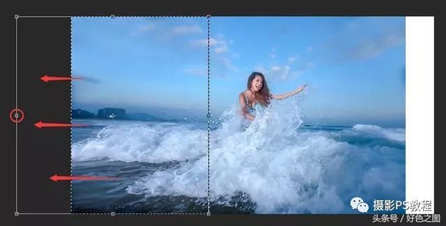 另一边也是同样的操作。因为背景是海水,也不怕变形,这样小幅度变形也看不出来,如果修建筑或者其他有纵向线条的背景时,需要注意,不能拉扯幅度太大。现在看看宽幅照片的效果: